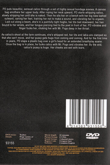 Play Thing - DVDArtikelnr DVDHDTD31556 Titel Play Thing Serie och volym Distributör Hardtied Studio Hardtied Handling PD puts beautiful, sensual calico through a set of highly sexual bondage scenes. A canvas bag smothers her upper body. After roping her neck upward, PD starts whipping calico, slowly stripping her until she is naked. Then he sits her on a bench with her big toes lashed outward, caning her feet, training her not to make a sound, and vibrating her to orgasm. Laid out along a beam, she is in a painfully tight hogtie, her tits tied downward, her hair bound to her wrists, and her tongue piercing tied to the post in front of her. PD vibrates and finger fucks her, choking her with Mr. Pogo deep in her throat. Typ Straight, Bondage, Domination, Toys, Medverkande (Star) Not Available, , , , Land Usa Språk English Regi Not Available Speltid 60 min System Lagerstatus Varan finns i lager Lagernr 133982 |